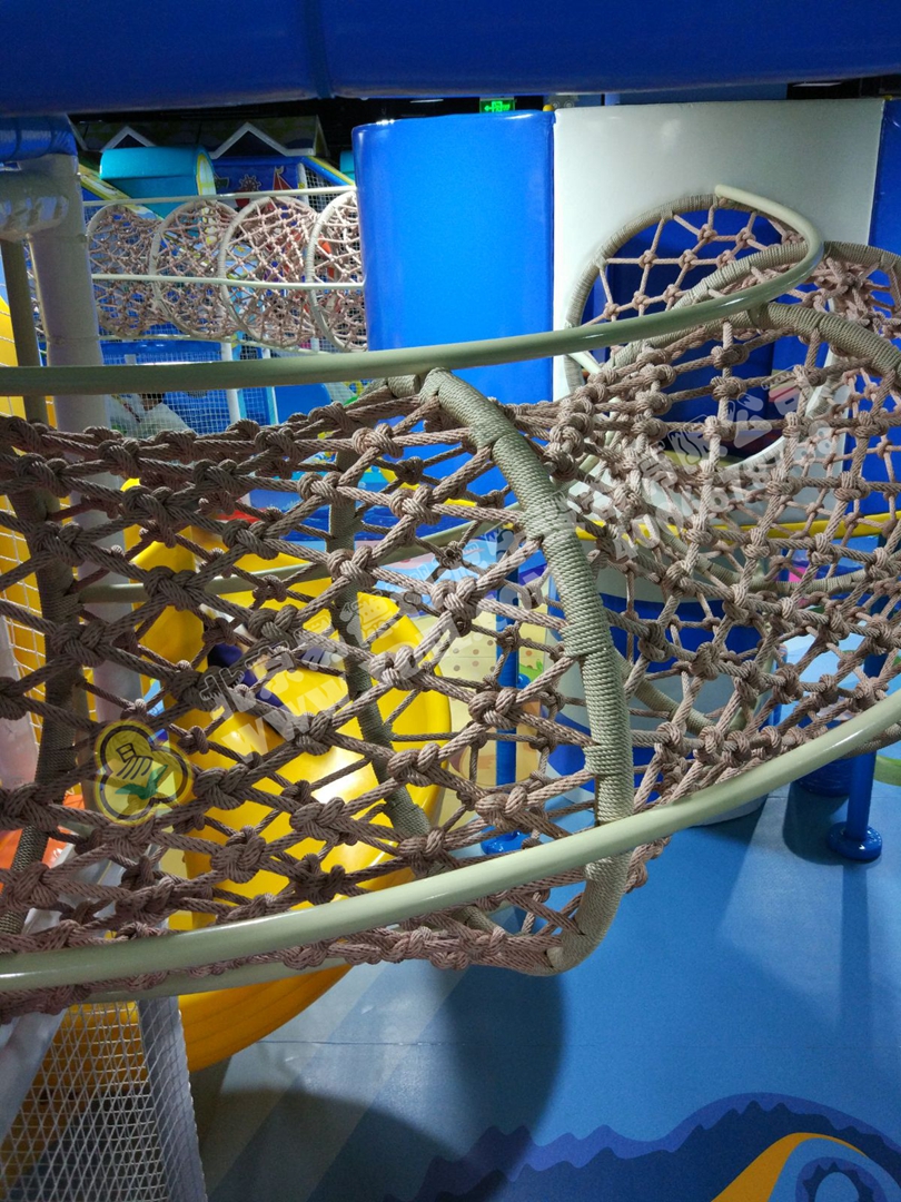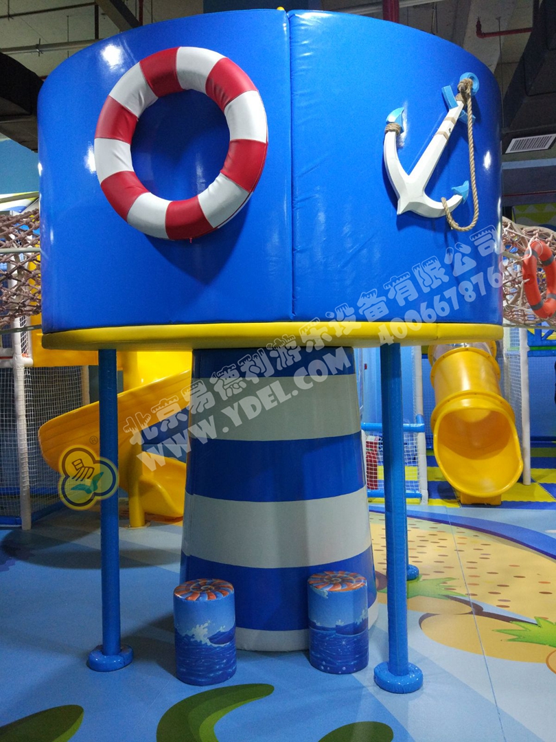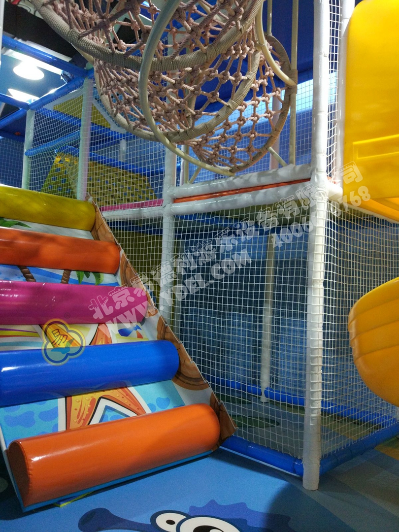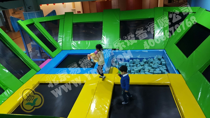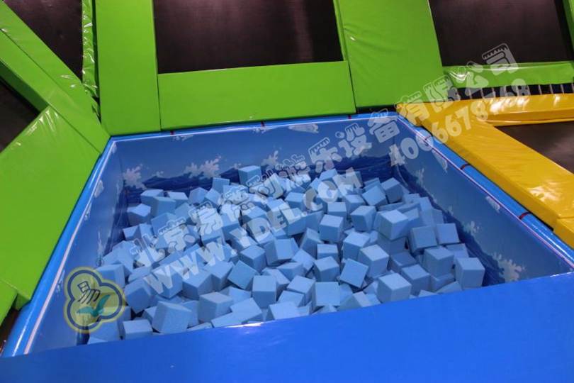 正面蹦,側面蹦,這就是超級蹦床的無限可能,一言不合就跳入中間的海綿塊池體中暢游。框架爬上燈塔瞭望臺,又順著網繩爬到球池上方,中心投影大滑梯,生動互動。