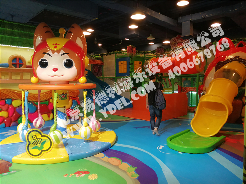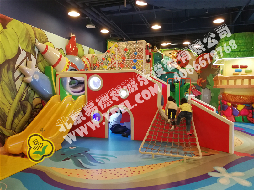 通州萬達寶貝王淘氣堡高端樹屋造型pu,色彩鮮艷亮麗,形象逼真,另類全軟包式滑梯,從下面鉆進去進入上方網繩,可以從主滑道下去也能側邊滑道溜下,還有繩網上下通道,主題形象突出。
