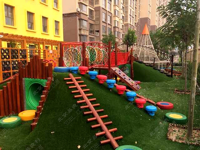 蒙正幼兒園戶外整體設(shè)計(jì)獨(dú)特新穎的土堡繩網(wǎng)橋梁設(shè)計(jì),兼具攀爬、鉆洞等功能組合;全手工編織“巫師帽”網(wǎng)繩,新奇好玩;采用進(jìn)口非洲紅梨木各種拓展設(shè)備,外觀大方、防裂防潮功能強(qiáng);