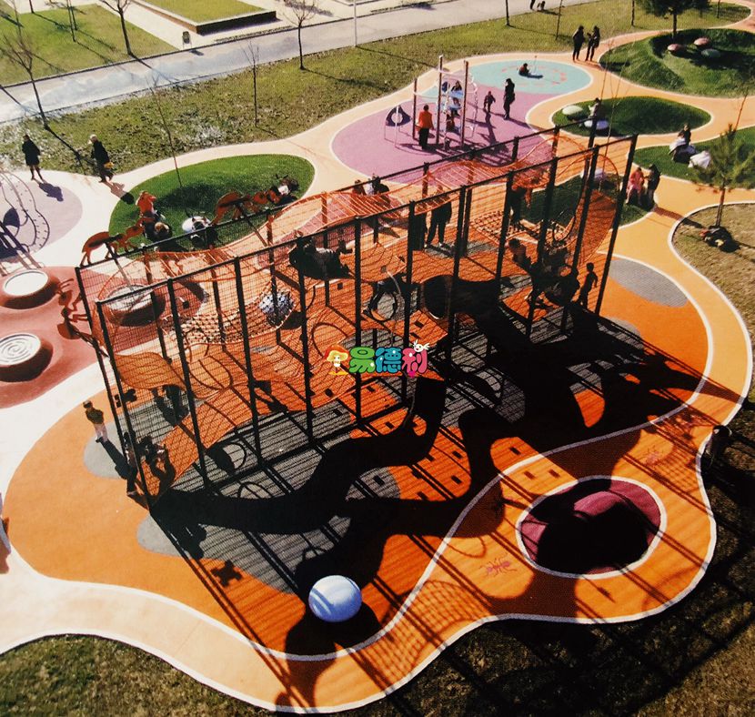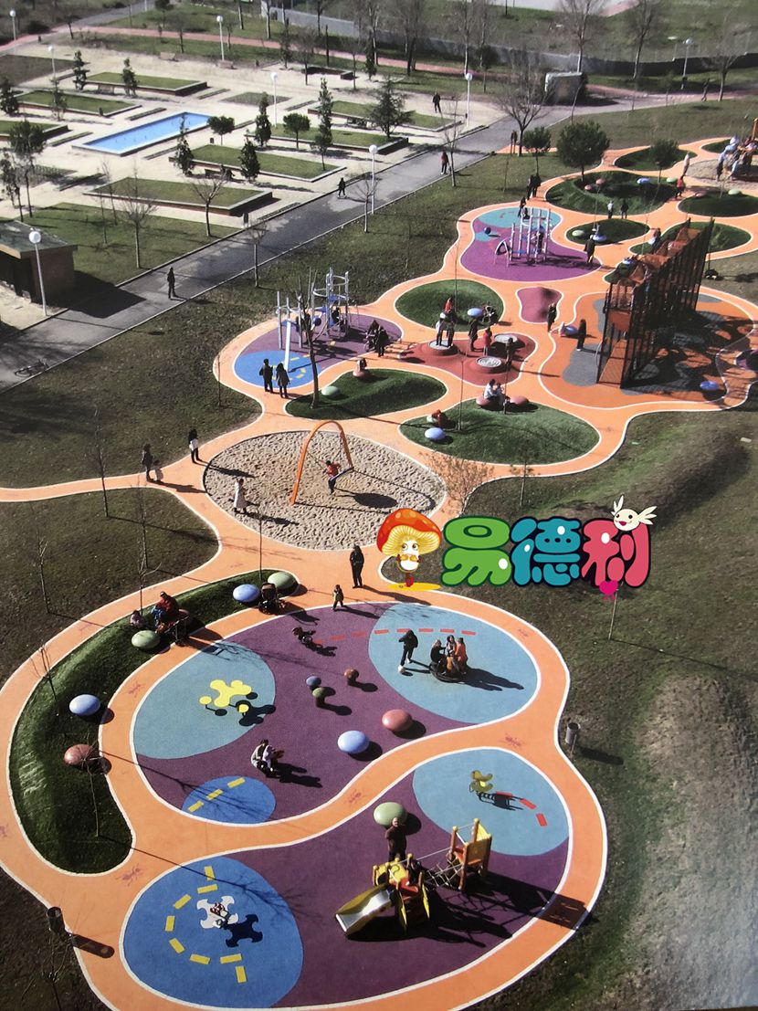在這個項目中,場地的布局規(guī)劃主題是蟻塚。因此,平面圖再現(xiàn)了螞蟻這些昆蟲制造的各種道。可愈有道在游樂場各處都以不同形式呈現(xiàn)螞蟻的形象;在人行道上有螞蟻的繪畫,用于指示路線; 游樂場設(shè)施的形狀,以及整個游樂場都是螞蟻的輪廓。為了區(qū)分游樂場各個區(qū)域,鋪設(shè)的材料以及選取的顏色不盡相同。連接著各個游樂區(qū)域的曲道是由橙色的瀝青鋪設(shè)而成; 中間差不多400 平方米的空隙部分鋪上人工草皮,創(chuàng)造11個小的波浪起伏的綠色山丘。兩個圓形部分用石英砂鋪上,周邊則用不同顏色的橡膠鋪設(shè): 紫色配上深藍(lán),或紅色配上灰色和黃色。平坦的游戲區(qū)域和火山口形狀的表面,地形的曲線完美地與兒童在玩耍時的移動呼應(yīng)。
